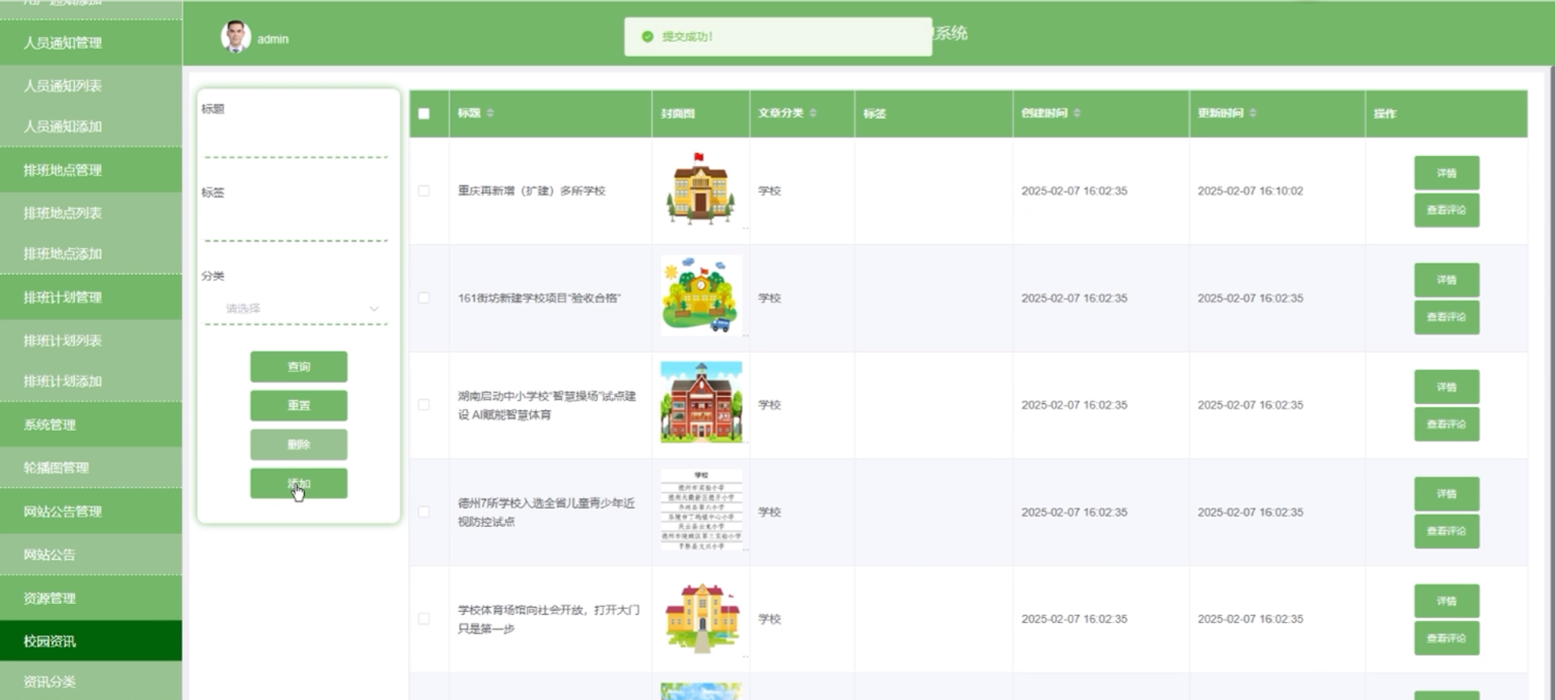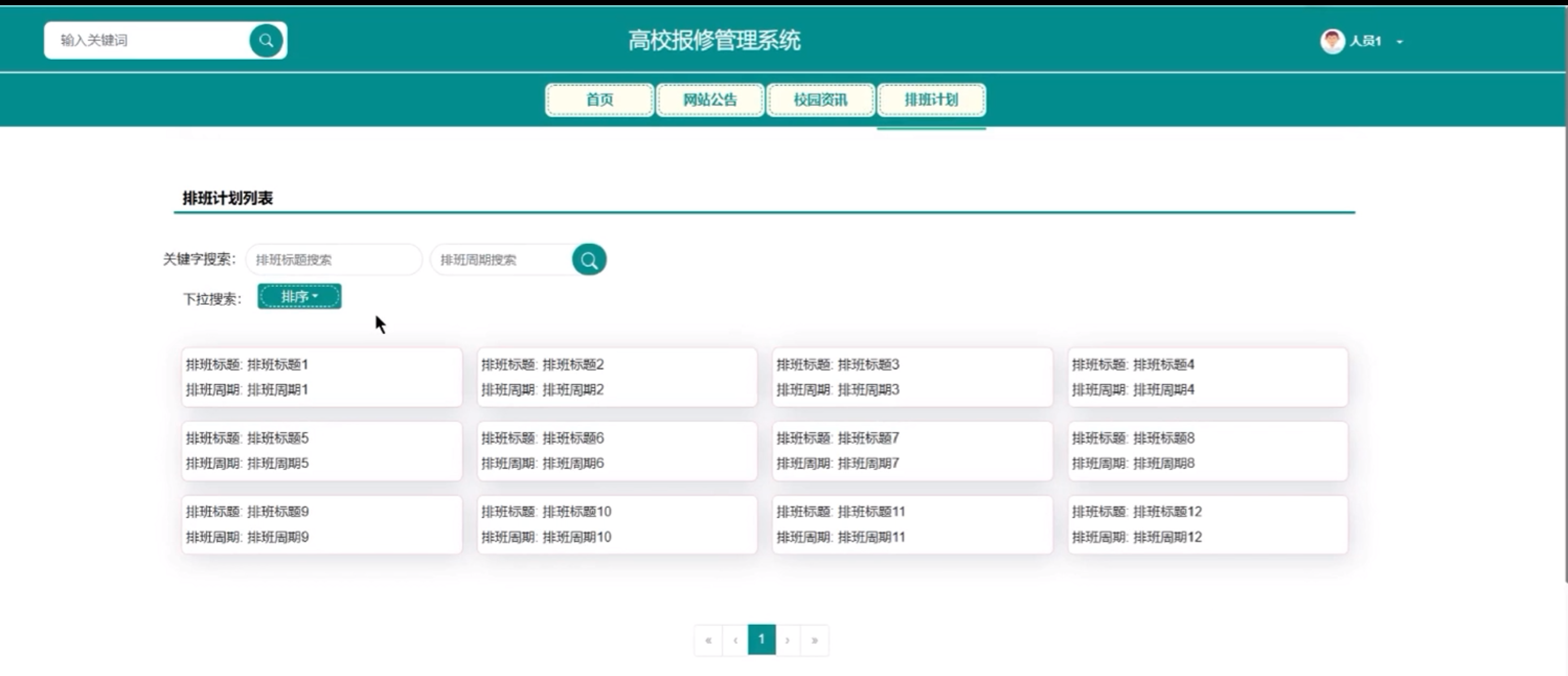 (2)首页:当维修人员进入高校报修管理系统的时候,首先映入眼帘的是系统首页、网站公告、校园资讯、排班计划等内容。