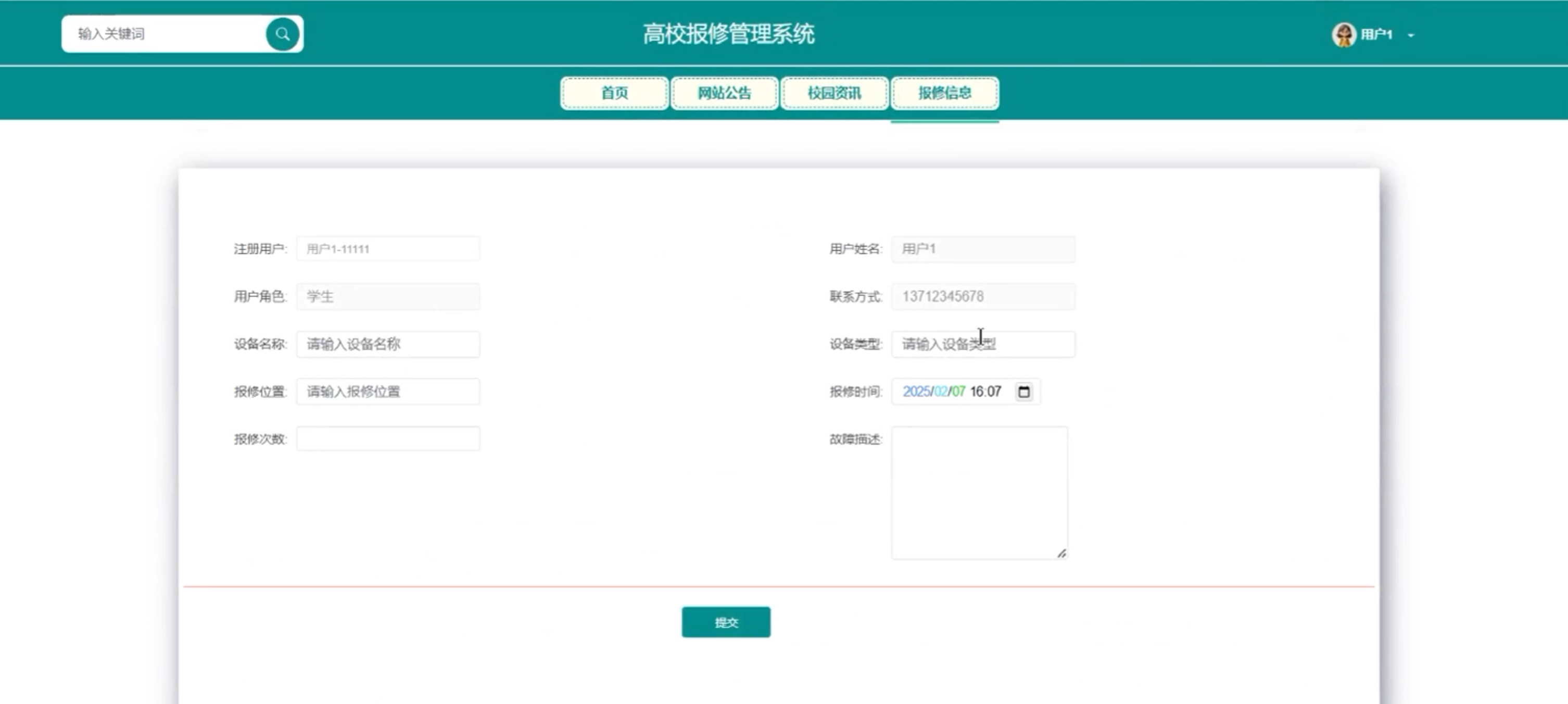 (5)报修信息:用户点击可填写报修信息,包括注册用户、用户姓名、用户角色、联系方式、设备名称、设备类型、报修位置、报修时间、报修次数和故障描述。