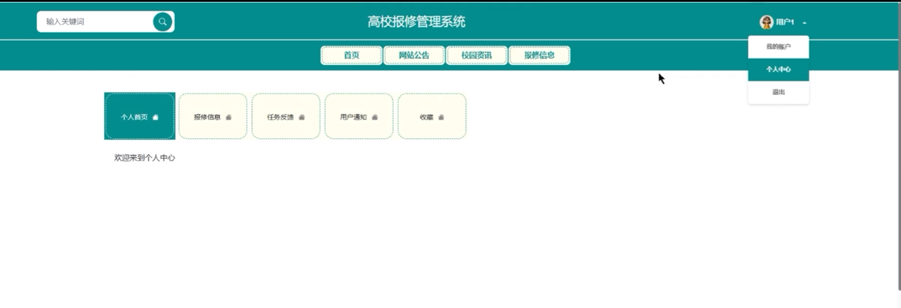 (7)个人中心:个人中心包含多个功能模块,如个人首页、报修信息、任务反馈、用户通知和收藏。可点击相关功能进行查看和管理。