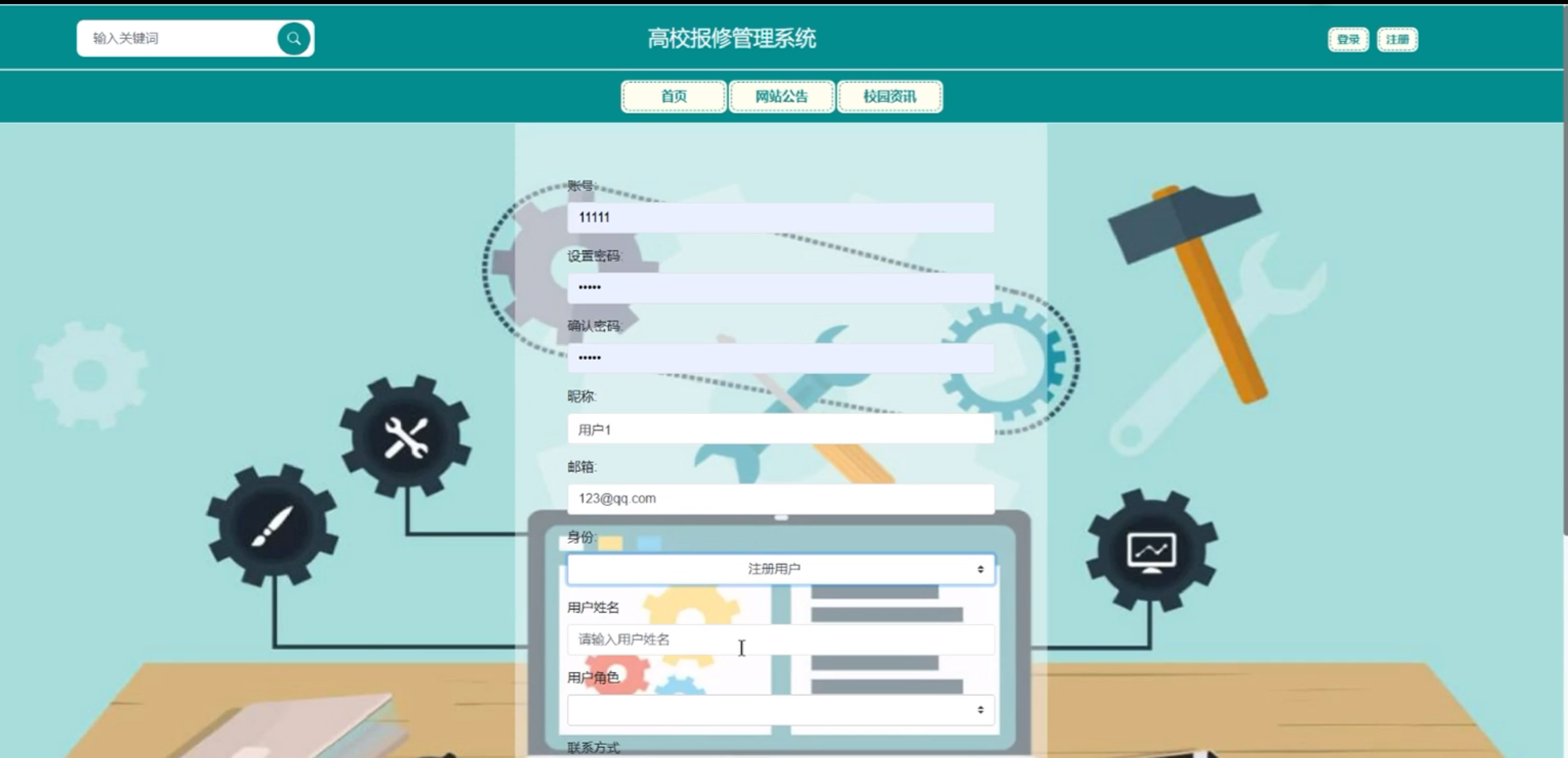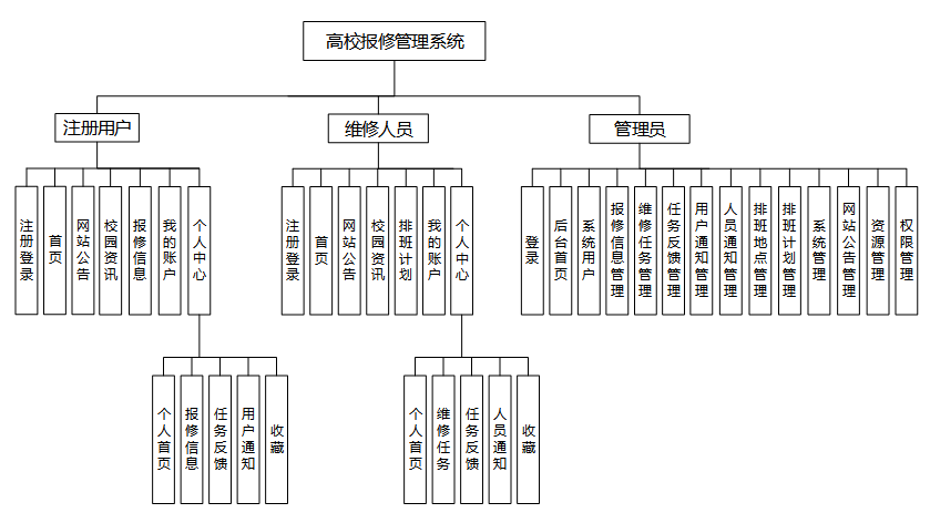 高校报修管理系统从角色上划分为了注册用户、维修人员以及管理员三种角色。