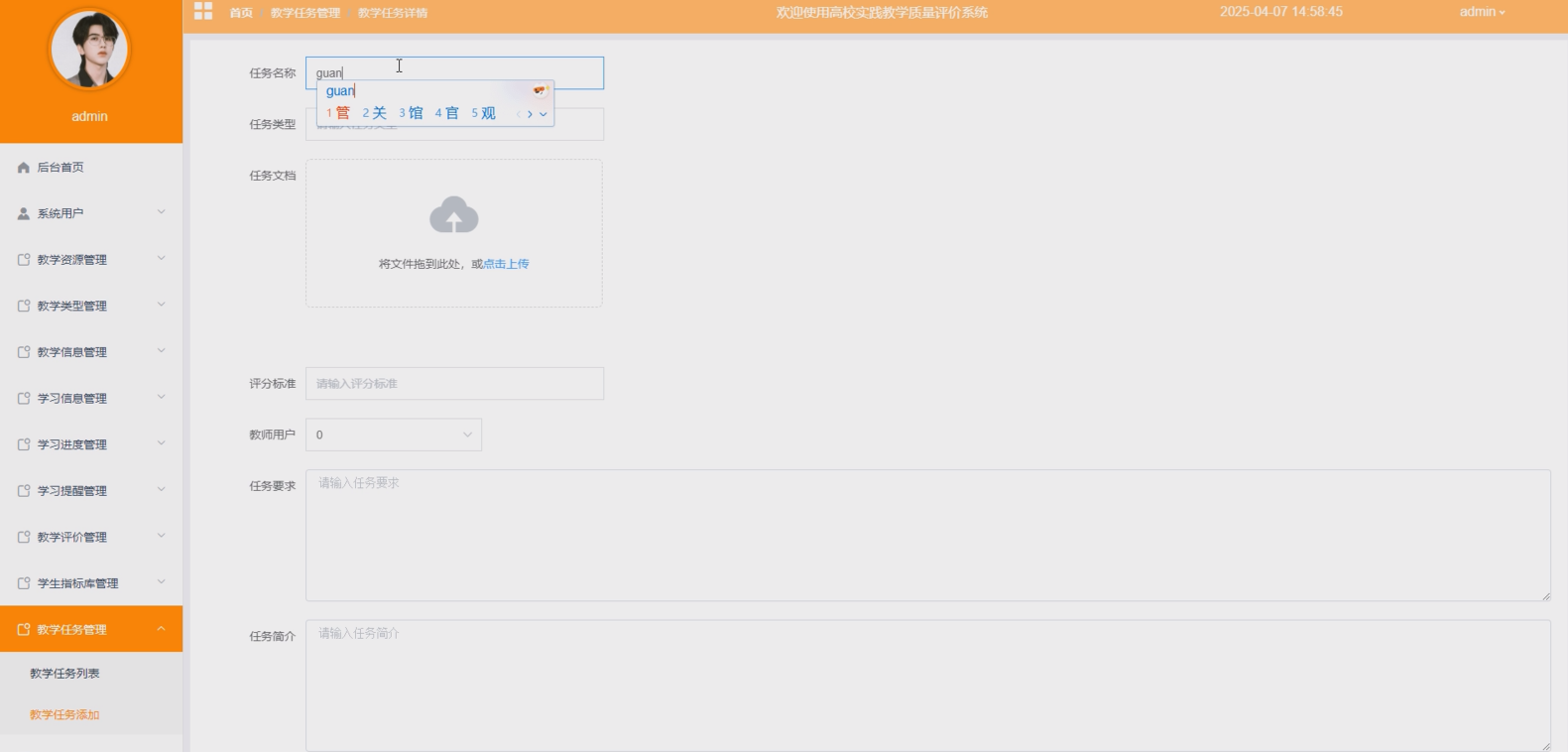 管理员在教学任务添加页面填写任务信息,设置任务要求并提交。系统提示添加成功或失败,管理员可在任务列表中查看新增任务。教学任务添加界面如图5-20所示。