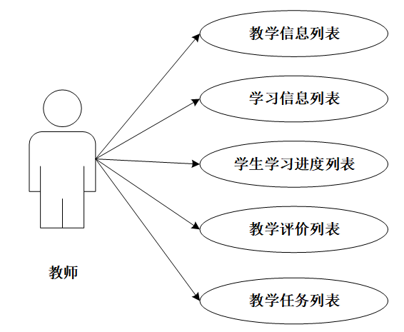 教师功能涵盖教学信息列表查看、学习信息列表管理、学生学习进度列表查看、教学评价列表管理和教学任务列表查看。教师可以查看教学信息列表,管理学习信息列表,查看学生学习进度列表,管理教学评价列表,并查看教学任务列表。这些功能帮助教师全面掌握教学情况,管理学生学习进度和评价。