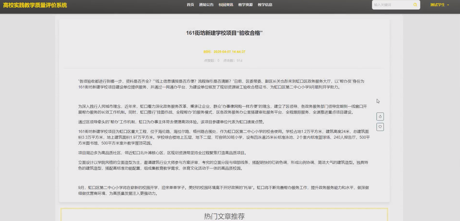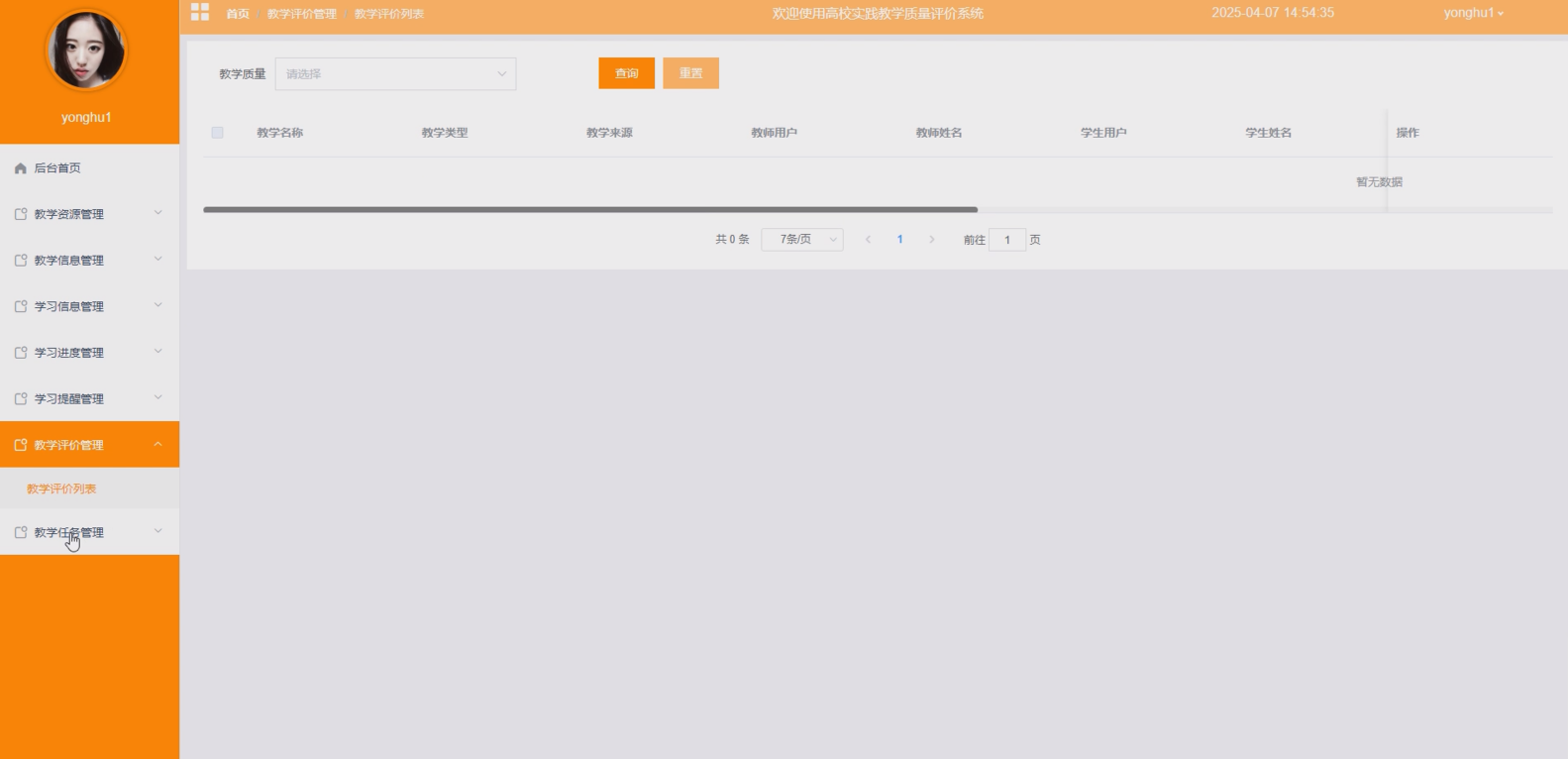 After the system went online, it ran stably and received good user feedback. Through the application of the system, the efficiency of evaluating the quality of practical teaching in universities has been significantly improved, and the ability to process and analyze data has been greatly enhanced. Users can conveniently access teaching resources and participate in teaching evaluations; Teachers can grasp students' learning progress and evaluation feedback in real time; Administrators can efficiently manage teaching resources and system permissions. Practice has proven that this system effectively addresses the drawbacks of traditional models and provides strong technical support for the continuous improvement of teaching quality in universities.