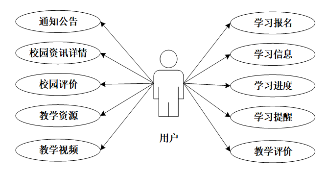 用户功能包括通知公告查看、校园资讯详情浏览、校园评价提交、教学资源访问、教学视频观看、学习报名操作、学习信息查询、学习进度跟踪、学习提醒接收和教学评价完成。用户可以查看通知公告和校园资讯详情,提交校园评价,访问教学资源和观看教学视频。用户能够进行学习报名,查询学习信息,跟踪学习进度,接收学习提醒,并完成教学评价。