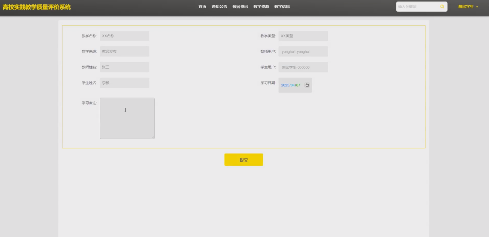 用户在教学评价页面选择课程,填写评价内容并提交。系统实时反馈提交结果,用户可查看已提交的评价记录。教学评价界面如图5-10所示。
