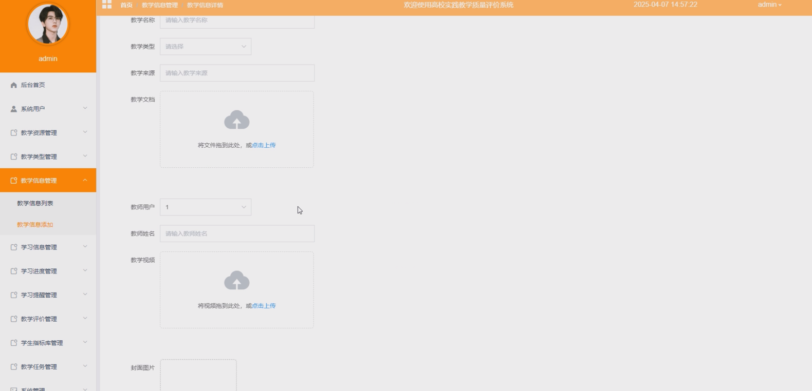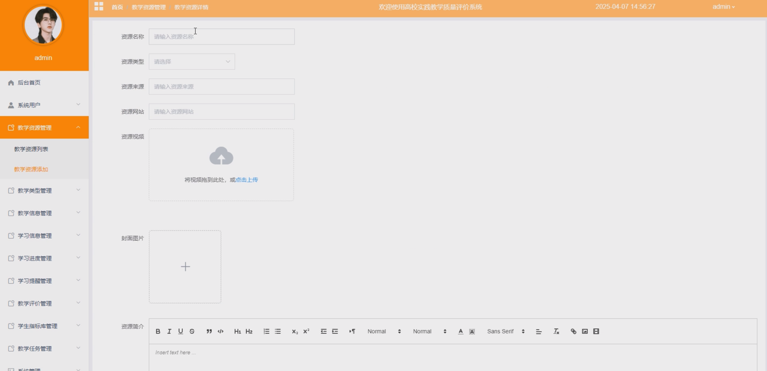 管理员在教学资源添加页面填写资源信息,上传资源文件并提交。系统提示添加成功或失败,管理员可在资源列表中查看新增资源。教学资源添加界面如图5-17所示。