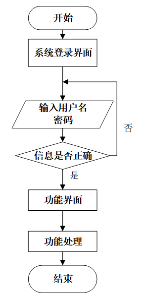 用户首先进入系统登录界面,输入用户名和密码后,系统验证信息是否正确。若验证失败,返回登录界面重新输入;若验证成功,则进入功能界面,执行相应功能处理后结束操作流程。操作流程如图3-5所示。
