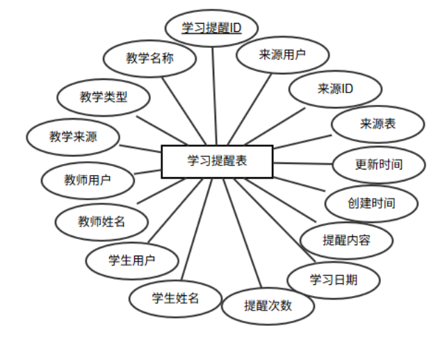 学习提醒实体包括学习提醒ID、教学名称、教学类型、教学来源、教师用户、教师姓名、学生用户、学生姓名、学习日期、提醒次数等。实体图如图4-9所示。