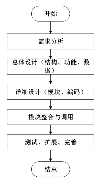 系统开发流程的主要步骤,从需求分析到系统完成的全过程。流程包括需求分析、总体设计(结构、功能、数据)、详细设计(模块、编码)、模块整合与调用,以及测试、扩展和完善,最终完成系统的开发。本系统的开发流程如图3-3所示