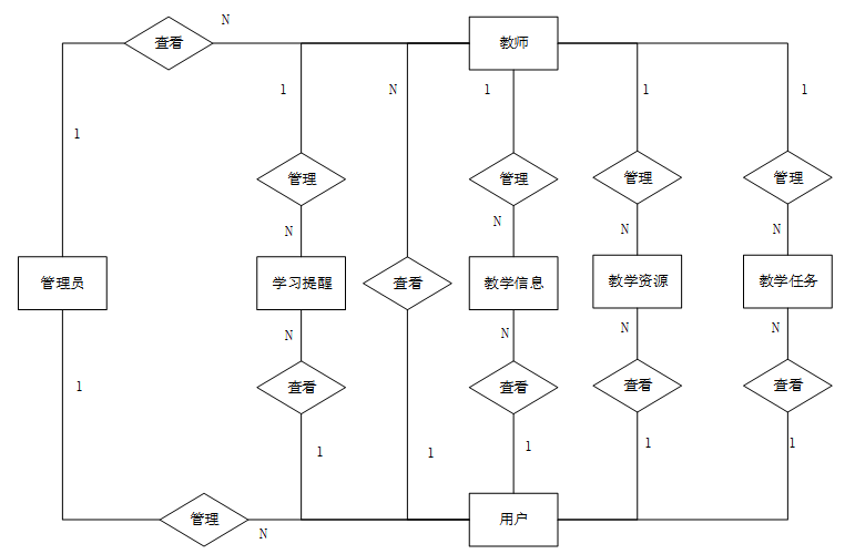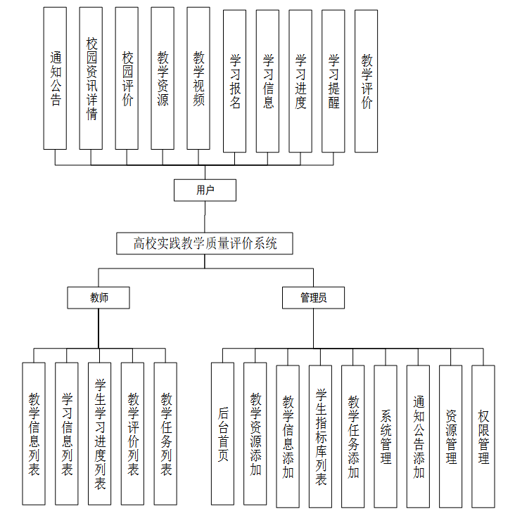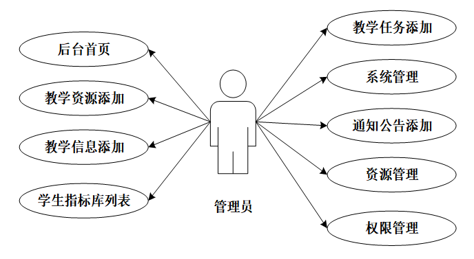管理员功能包括后台首页管理、教学资源添加、教学信息添加、学生指标库列表管理、教学任务添加、系统管理、通知公告添加、资源管理和权限管理。管理员能够管理后台首页,添加教学资源和教学信息,管理学生指标库列表,添加教学任务,进行系统管理,添加通知公告,管理资源,并进行权限管理。这些功能确保管理员对整个系统进行高效管理和维护。
