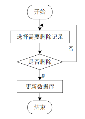 用户选择需要删除的记录后,系统判断是否确认删除。若未确认,返回选择环节;若确认删除,则更新数据库,删除对应记录,完成操作后流程结束。删除信息流程图如图3-8所示。