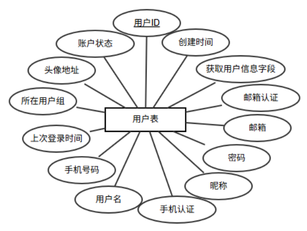 用户实体包括用户ID、账户状态、所在用户组、上次登录时间、手机号码、手机认证、用户名、昵称、密码、邮箱、邮箱认证、头像地址等。实体图如图4-14所示。