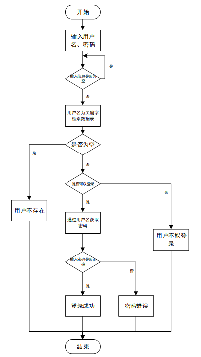 用户输入用户名和密码后,系统先检查输入是否为空,再验证用户名是否存在,若存在则通过用户名获取密码并校验。若密码正确则登录成功,否则提示密码错误。若用户名不存在或无法登录,提示用户操作无效。如图3-4所示。