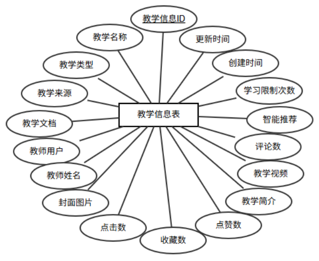 教学信息实体包括教学信息ID、教学名称、教学类型、教学来源、教学文档、教师用户、教师姓名、教学视频、封面图片、教学简介等。实体图如图4-11所示。