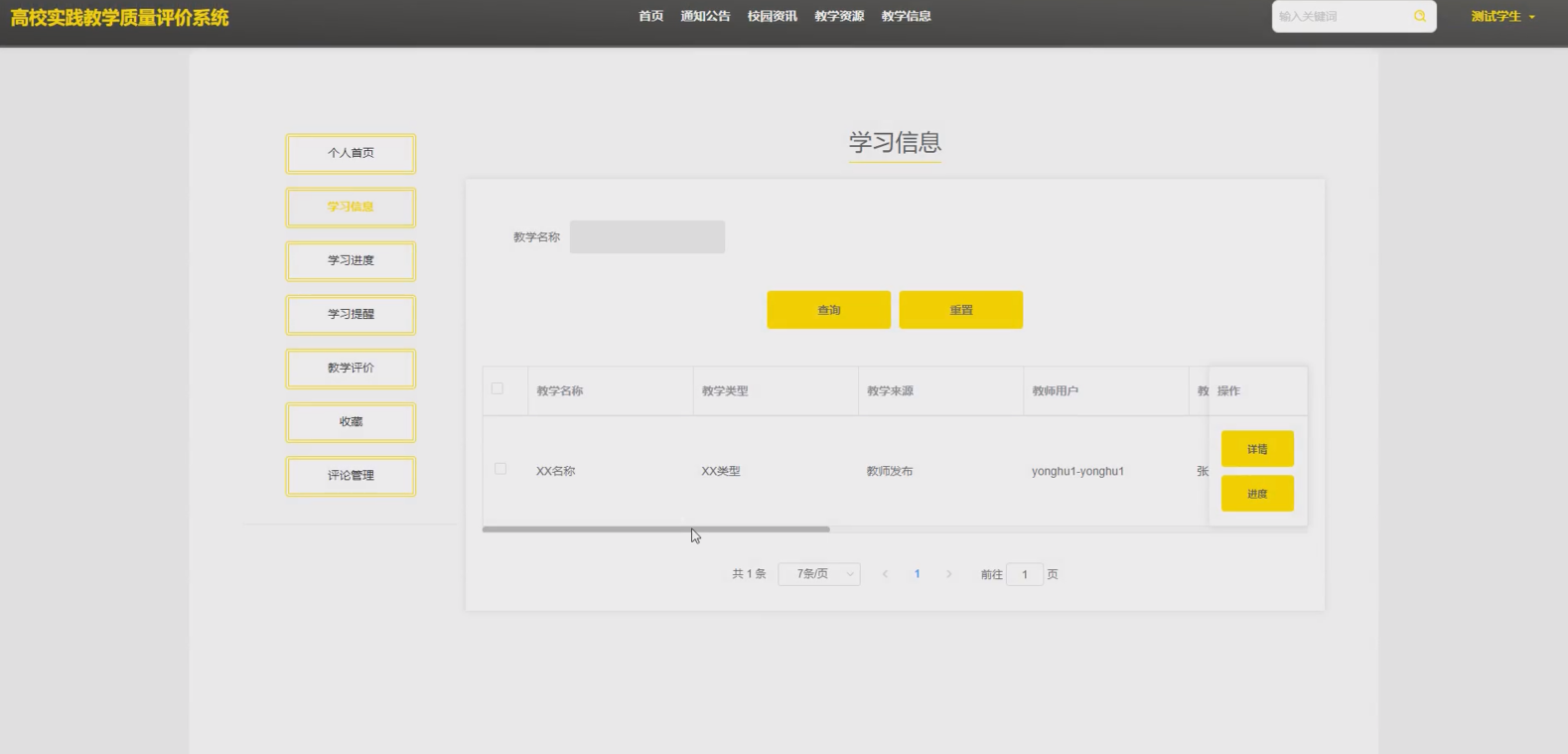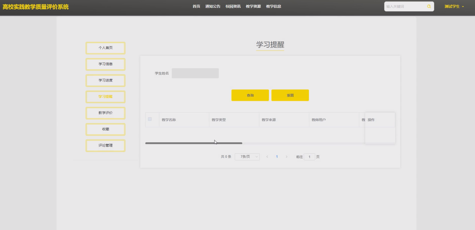 | 教学资源功能测试 | 1. 用户登录系统,进入教学资源页面。 2. 用户浏览教学资源列表,点击某资源名称查看详细信息。 3. 用户点击资源下载链接,尝试下载资源。 | 1. 用户成功登录系统,进入教学资源页面。 2. 用户能够查看教学资源列表,并成功点击查看某资源的详细信息。 3. 用户能够成功下载资源。 | 与预期结果一致 |