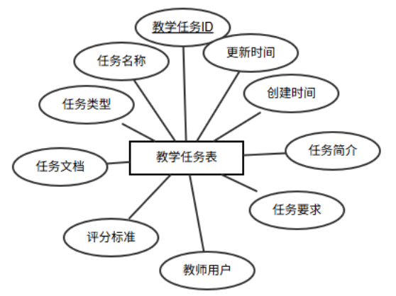 教学任务实体包括教学任务ID、任务名称、任务类型、任务文档、评分标准、教师用户、任务要求、任务简介等。实体图如图4-13所示。