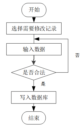 用户首先选择需要修改的记录,输入修改后的数据,系统判断输入数据是否合法。若数据不合法,提示重新输入;若数据合法,则将修改后的数据写入数据库,完成操作后流程结束。修改信息流程图如图3-7所示。