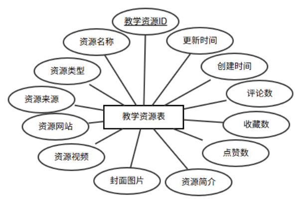教学资源实体包括教学资源ID、资源名称、资源类型、资源来源、资源网站、资源视频、封面图片、资源简介等。实体图如图4-12所示。