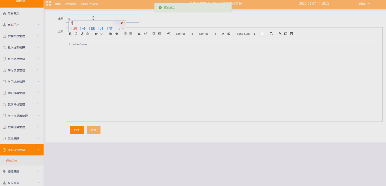 在操作层面,该系统的设计充分考虑了用户的需求和使用习惯。系统采用分层架构设计,将前端界面、后端服务和数据库分离,使得系统的操作流程清晰、简洁。前端界面基于Vue.js开发,具有良好的交互性和用户体验,用户可以通过直观的操作界面完成各项功能操作,如教学评价、资源管理等。后端服务通过SpringBoot框架实现,提供了强大的业务逻辑处理能力,能够快速响应用户的操作请求,并返回准确的结果。同时,系统还具备完善的权限管理机制,确保不同用户角色(如学生、教师、管理员)能够根据自身的权限进行相应的操作,从而保障系统的安全性和稳定性。