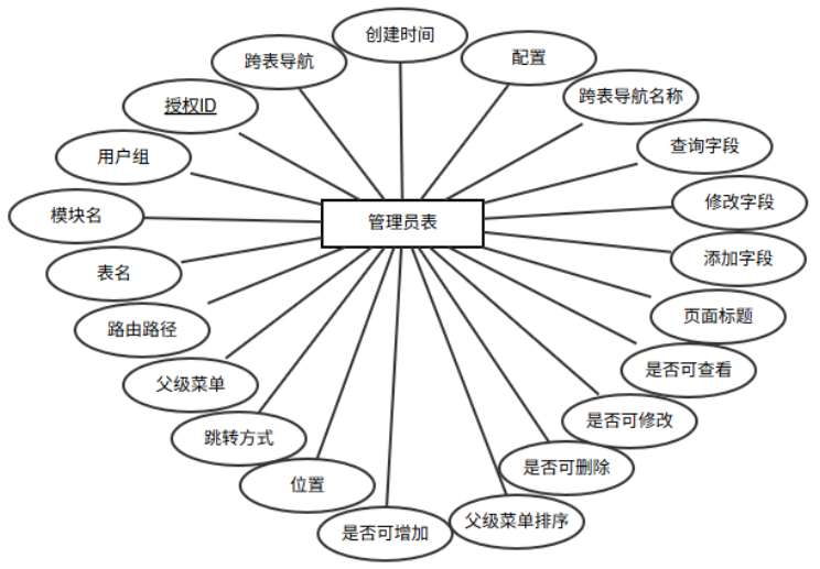管理员实体包括授权ID、用户组、模块名、表名、页面标题、路由路径等。实体图如图4-8所示。
