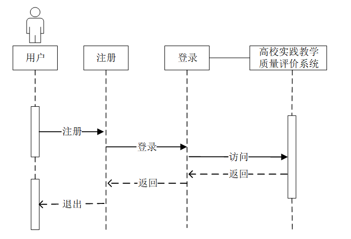 用户通过注册模块发送注册请求,系统完成注册后返回确认信息。随后,用户通过登录模块发送登录请求,系统验证用户信息后允许访问目标系统。用户完成操作后可选择退出,系统终止会话。注册时序图,如图4-3所示。