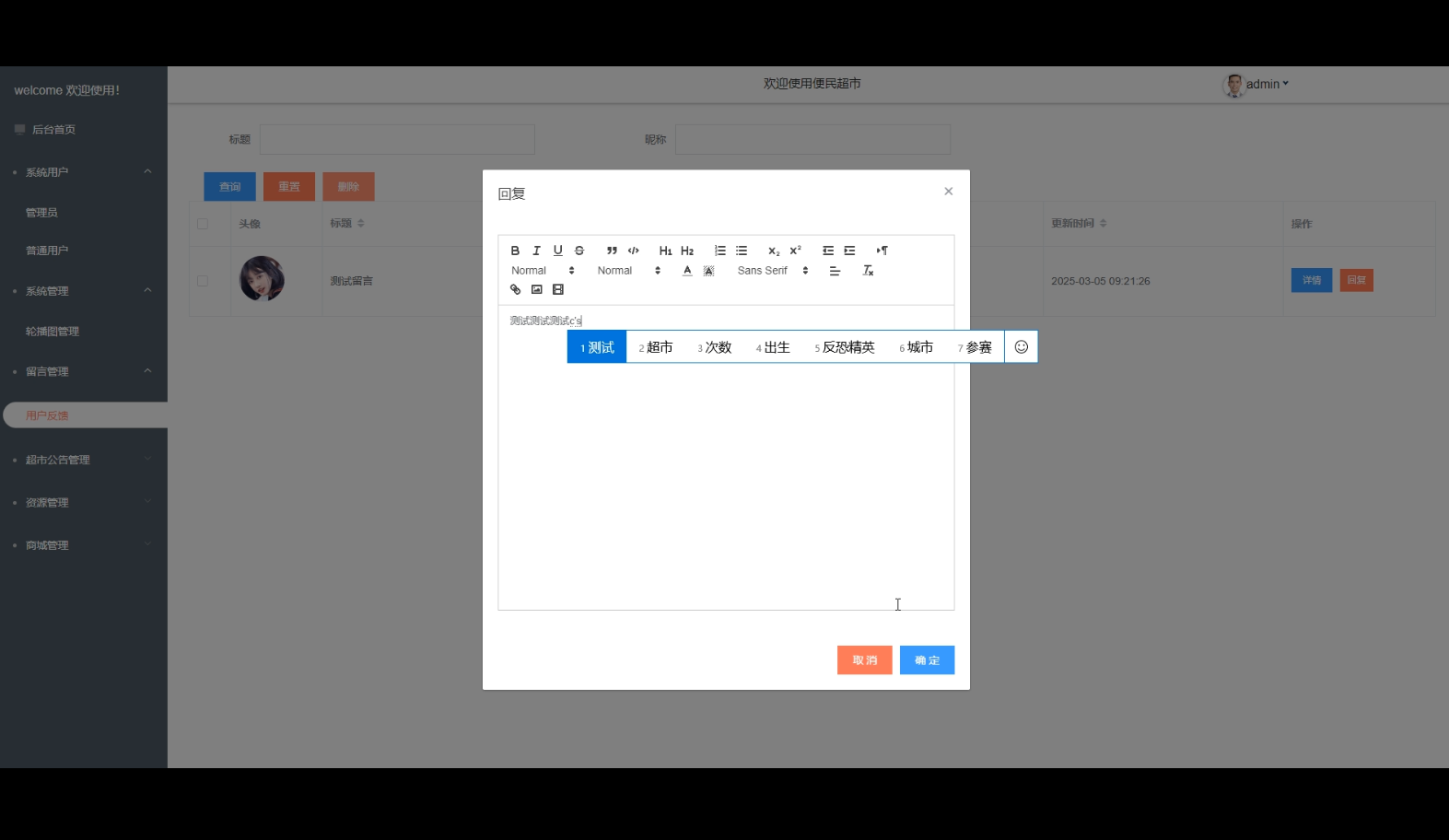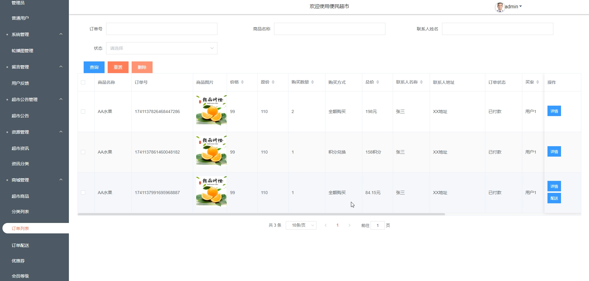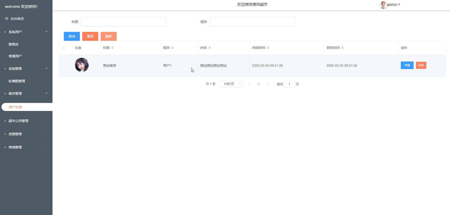 With the rapid development of mobile Internet and e-commerce, the operation mode of traditional supermarkets gradually shows some shortcomings. Traditional supermarkets mainly rely on offline physical stores for operation, and consumers need to go to the store to purchase goods, with relatively single payment methods. This model has problems such as high operating costs, limited service time and space, and low data management efficiency. In order to improve user experience and operational efficiency, this system uses Vue to develop the front-end, SpringBoot to build the back-end, and MySQL as the database. The system provides users with functions such as viewing product information, adding shopping carts, purchasing products, querying orders, receiving user feedback, and viewing membership levels; Provide administrators with functions such as product management, message management, coupon management, order management, membership management, and user feedback management.