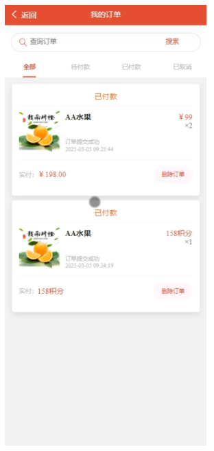 用户在订单页面可查看所有订单状态,包括待付款、待发货、已签收等。点击订单可查看详情,支持取消订单或申请退款。订单查询界面如图5-4所示。