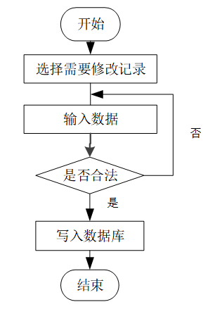 用户首先选择需要修改的记录,输入修改后的数据,系统判断输入数据是否合法。若数据不合法,提示重新输入;若数据合法,则将修改后的数据写入数据库,完成操作后流程结束。修改信息流程图如图4-4所示。