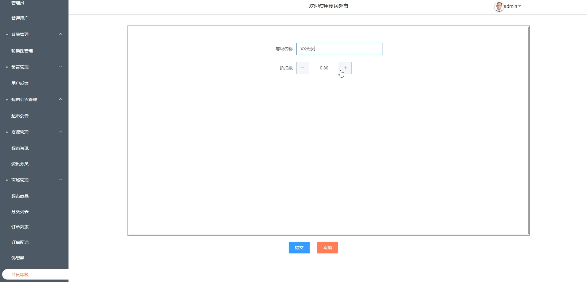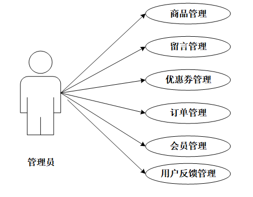系统为管理员提供以下功能:管理商品信息、管理留言、管理优惠券、管理订单、管理会员、管理用户反馈。