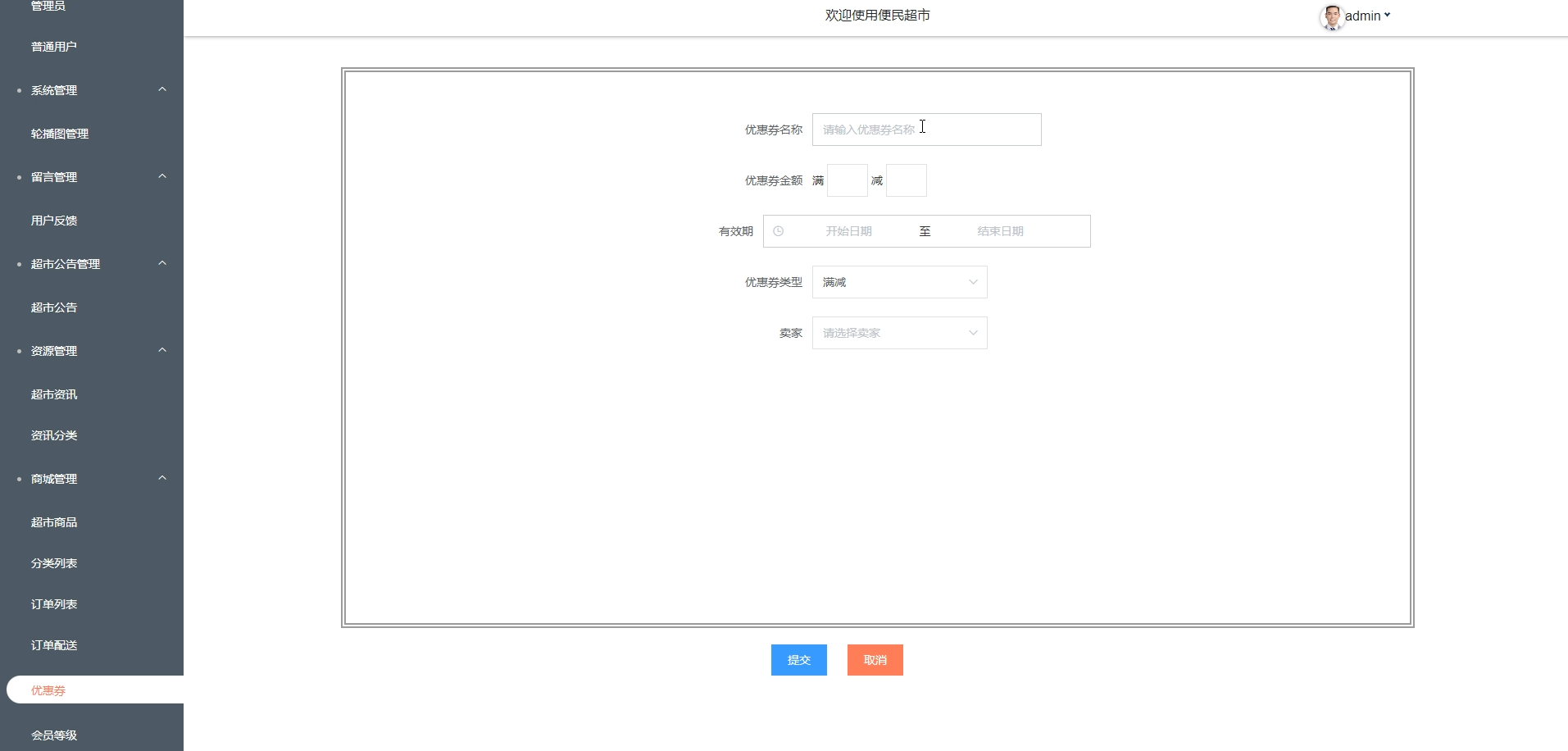 管理员在优惠券管理页面添加新优惠券,设置使用条件和有效期。可查看、编辑或删除现有优惠券,页面显示优惠券使用情况。优惠券管理界面如图5-9所示。