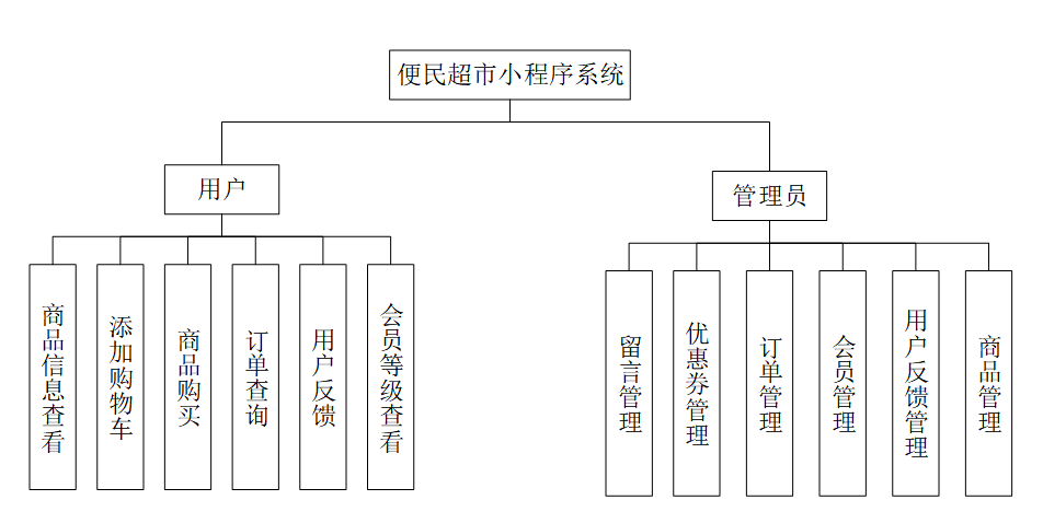 本系统为便民超市小程序,主要面向用户和管理员两类角色。用户功能包括查看商品信息、添加商品至购物车、完成购买、查询订单状态、提交反馈以及查看会员等级。管理员功能涵盖商品管理、留言管理、优惠券管理、订单管理、会员管理和用户反馈管理。系统通过整合线上线下资源,为用户提供便捷的购物体验,同时为管理员提供高效的管理工具,满足双方在购物与管理过程中的多样化需求,提升超市运营效率和服务质量。