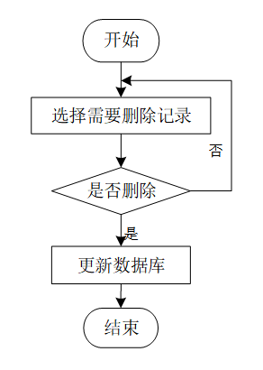 用户选择需要删除的记录后,系统判断是否确认删除。若未确认,返回选择环节;若确认删除,则更新数据库,删除对应记录,完成操作后流程结束。删除信息流程图如图4-5所示。