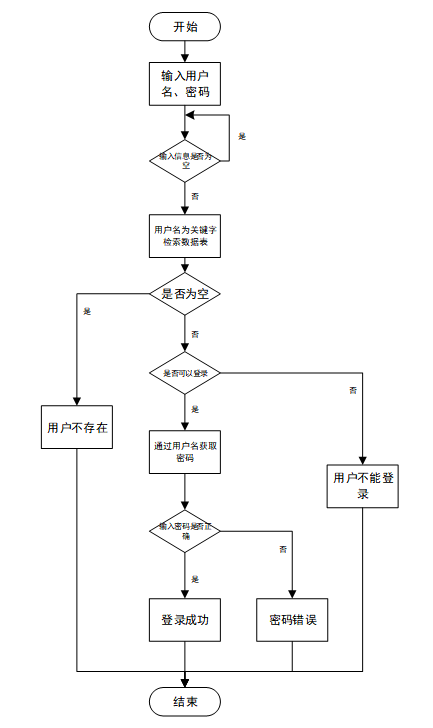 用户输入用户名和密码后,系统先检查输入是否为空,再验证用户名是否存在,若存在则通过用户名获取密码并校验。若密码正确则登录成功,否则提示密码错误。若用户名不存在或无法登录,提示用户操作无效。如图4-2所示。