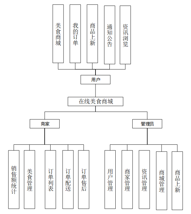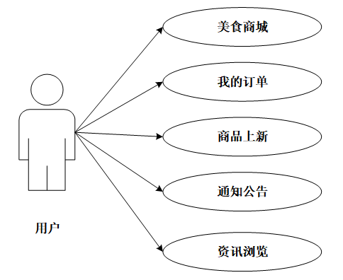 用户功能包括查看美食商城信息、收藏美食、将美食加入购物车、购买美食、增减购物车中美食数量;管理订单,删除订单、付款、取消订单、申请售后;对美食上新进行点赞、收藏、评论;浏览通知公告、关于我们、联系方式、网站介绍;浏览资讯并进行点赞、收藏、评论。