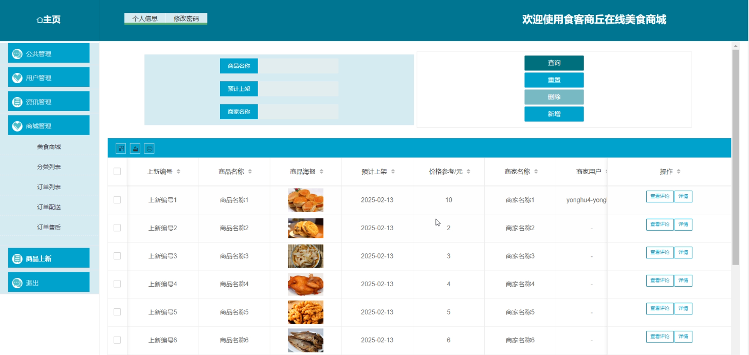 商家登录系统,进入“美食管理”页面。点击“新增美食”,填写名称、价格、图片等信息,系统将美食信息存入数据库并显示在商城页面;点击“修改美食”,选择目标美食,编辑信息后保存,系统更新数据库记录;点击“删除美食”,选择目标美食,系统提示确认后删除记录;点击“查看评论”,系统显示该美食的所有用户评论,商家可据此优化产品。如图3-5所示。