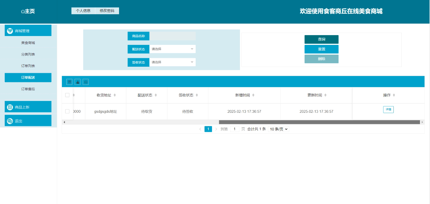 商家在“订单配送”页面对配送信息进行增删改查操作,跟踪配送进度,点击配送单可查看配送详情。订单配送界面如图5-9所示。