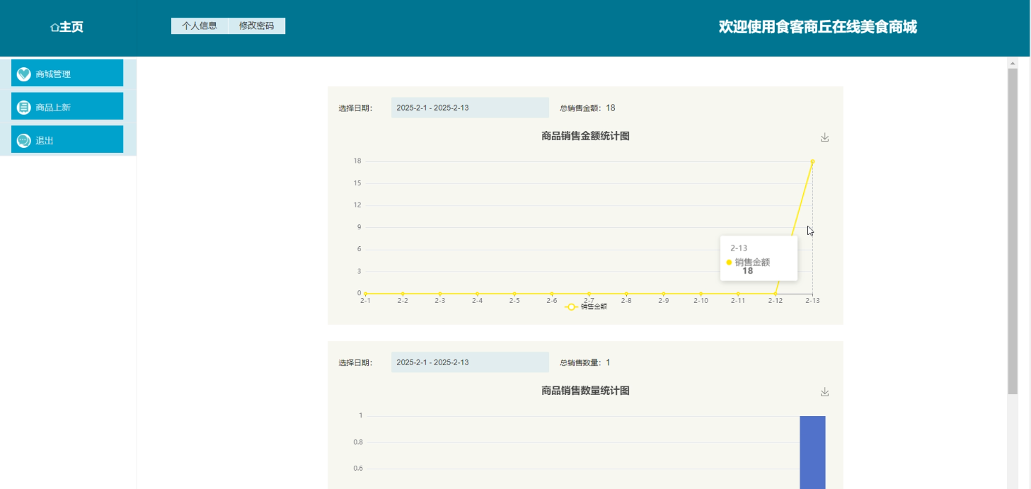 商家登录系统后,进入“销售额统计”页面,查看销售数量和销售金额的统计数据,系统以图表形式展示销售额趋势。销售额统计界面如图5-6所示。