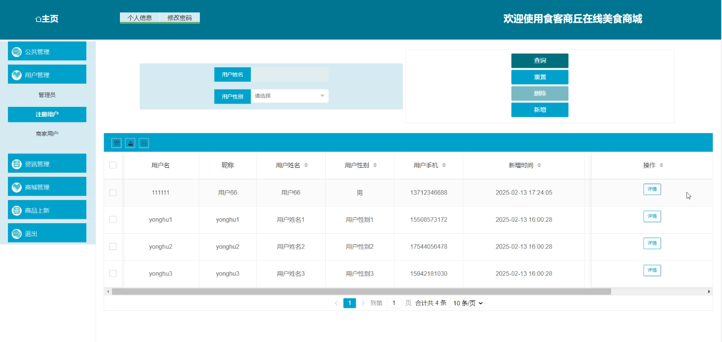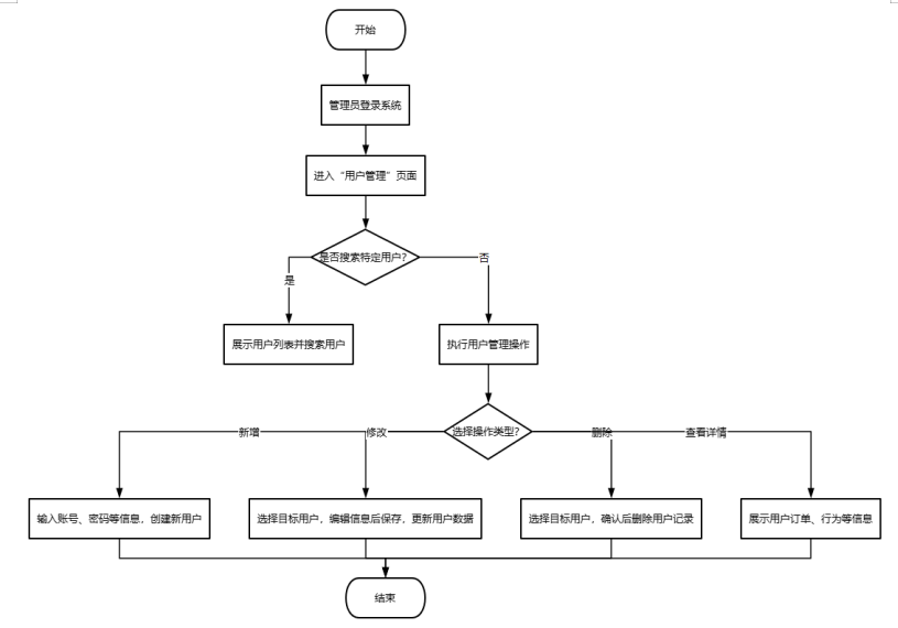 管理员登录系统,进入“用户管理”页面。系统展示用户列表,管理员可搜索特定用户。点击“新增用户”,输入账号、密码等信息,系统创建新用户记录;点击“修改用户”,选择目标用户,编辑信息后保存,系统更新用户数据;点击“删除用户”,选择目标用户,系统提示确认后删除用户记录;点击“查看用户详情”,系统展示用户订单、行为等信息,管理员据此进行管理决策。如图3-6所示。
