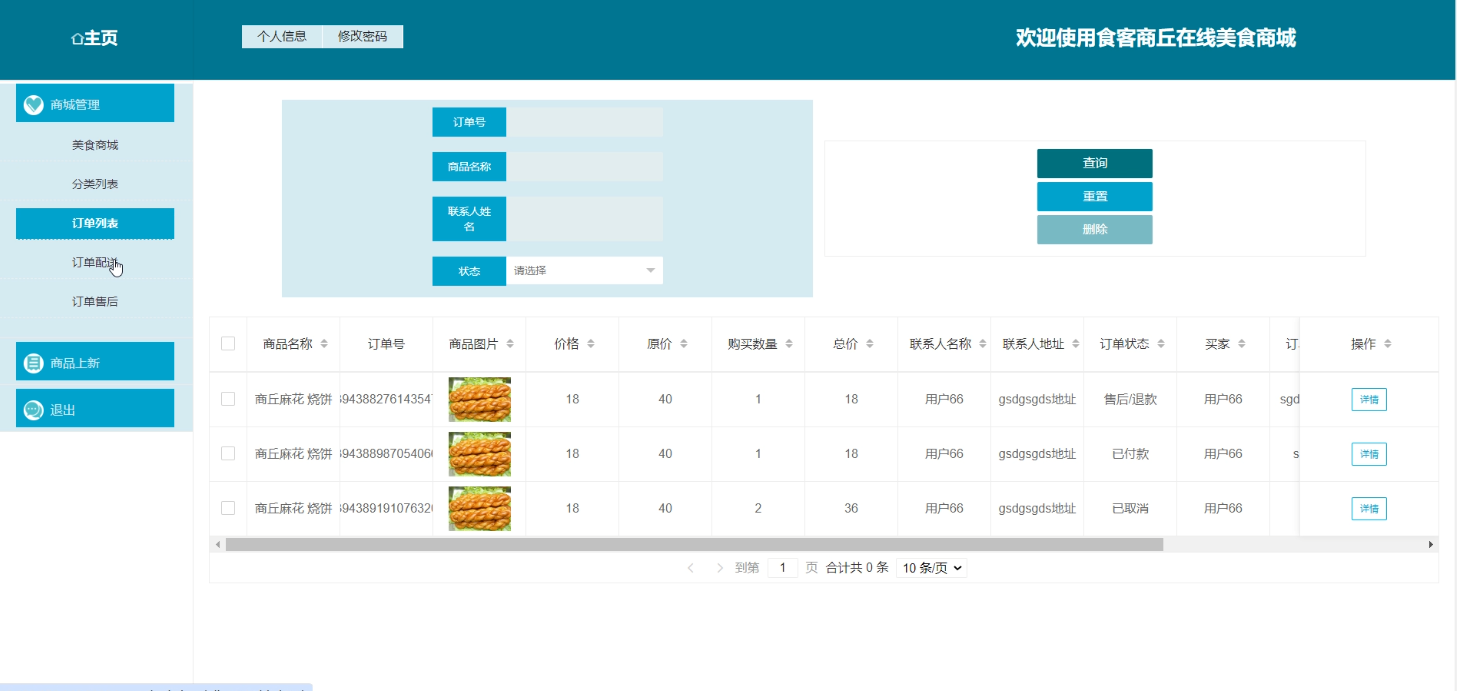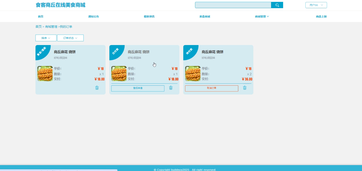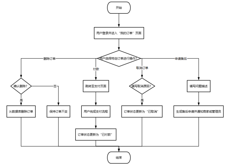 用户在系统中登录后,进入“我的订单”页面。系统显示所有订单列表,用户可选择特定订单进行操作。点击“删除订单”,系统提示确认,用户确认后订单从数据库删除;点击“付款”,系统跳转至支付页面,用户完成支付流程后,订单状态更新为“已付款”;点击“取消订单”,系统提示原因,用户填写后订单状态更新为“已取消”;点击“申请售后”,填写问题描述,系统生成售后申请并通知商家或管理员处理。如图3-4所示。