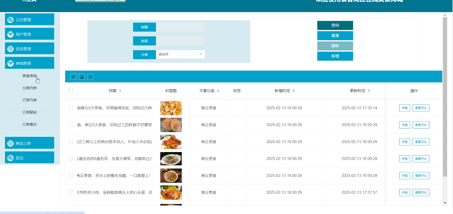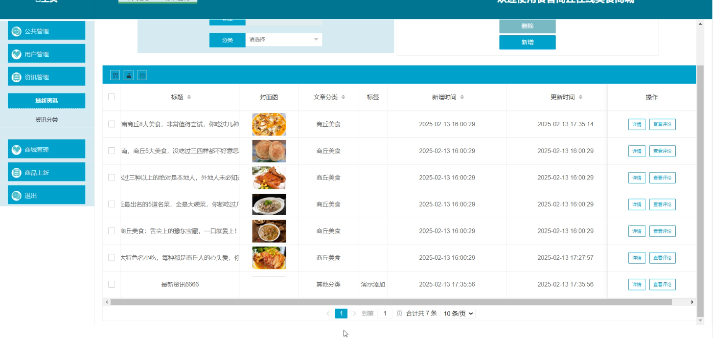 商家在“美食管理”页面对美食信息进行增删改查操作,点击“查看评论”按钮可查看用户对美食的评论内容。美食管理界面如图5-7所示。
