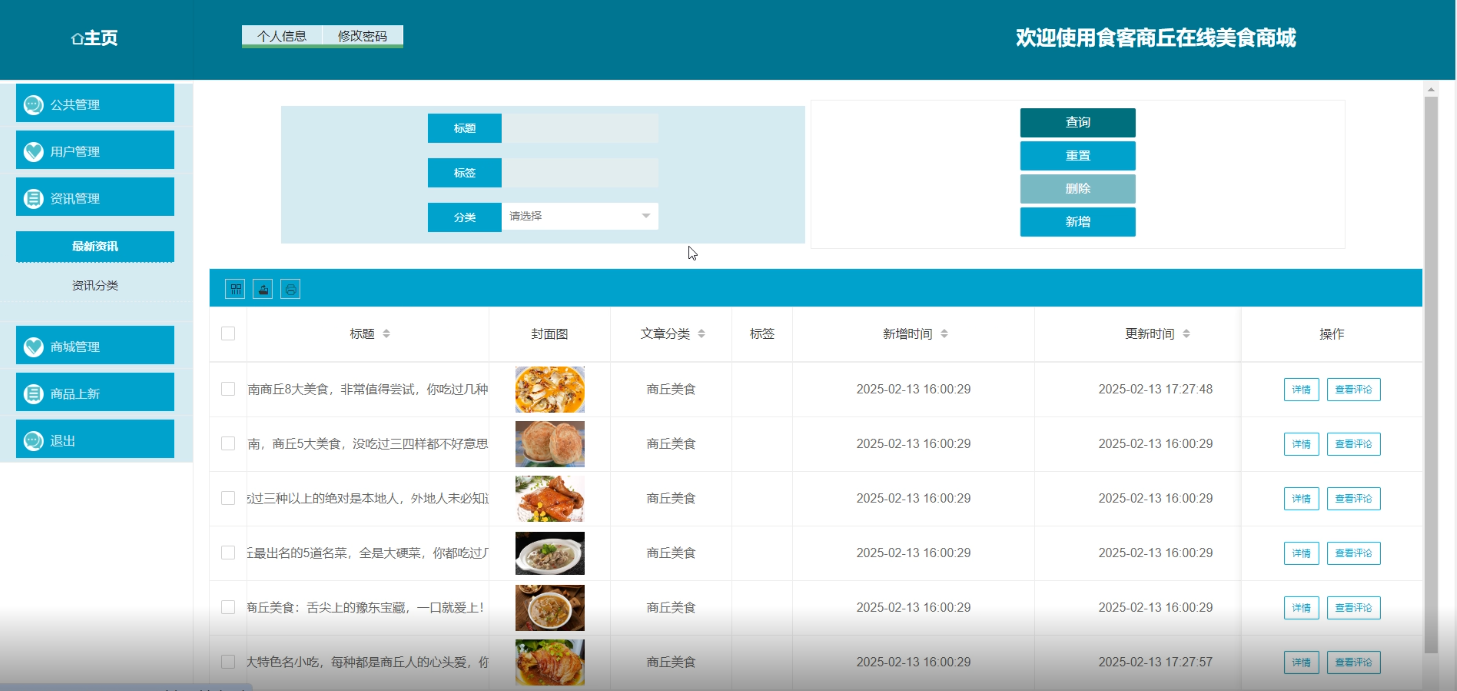 管理员在“资讯管理”页面对资讯进行增删改查操作,点击“查看评论”按钮查看用户对资讯的评论内容。资讯管理界面如图5-13所示。