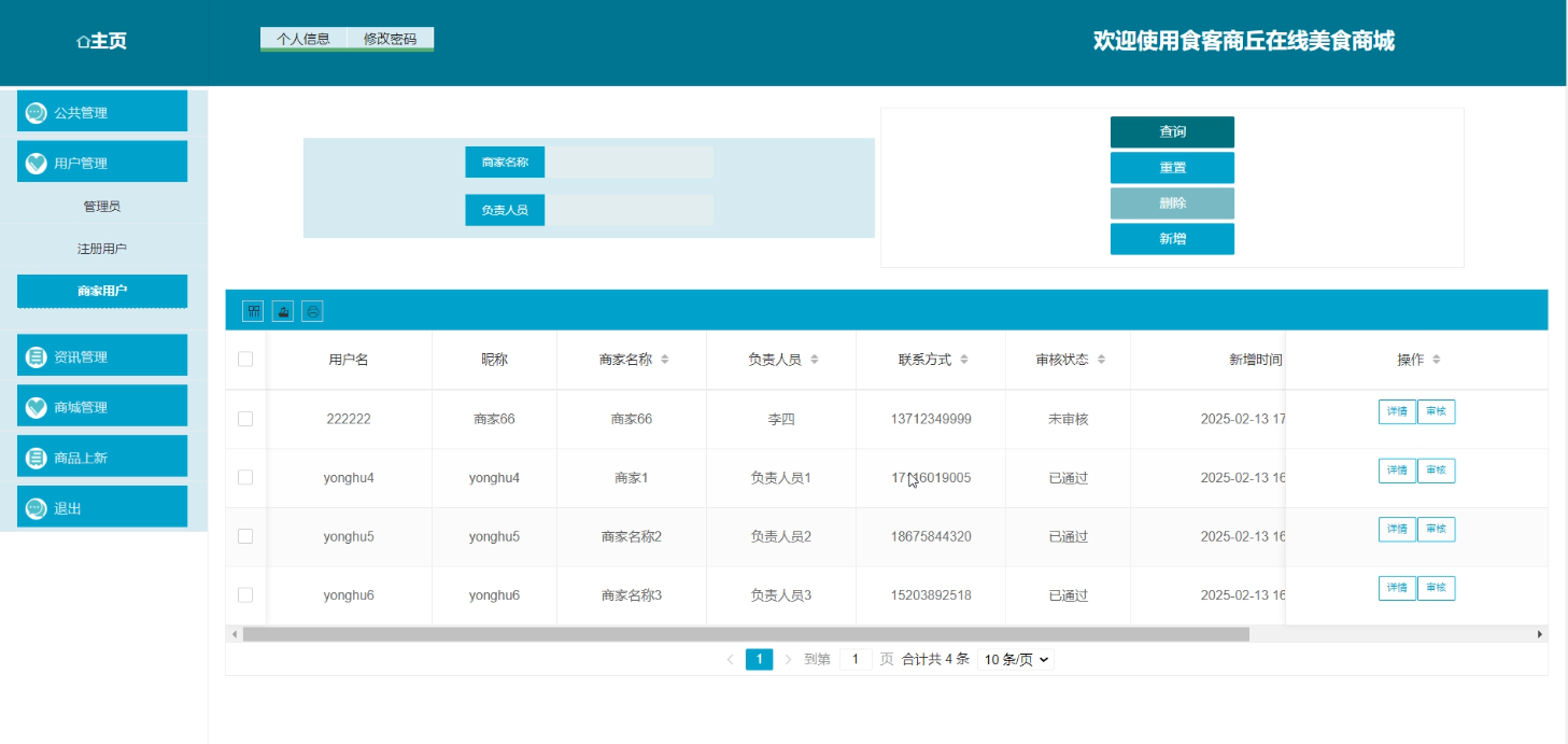 管理员在“商家管理”页面对商家信息进行增删改查操作,点击“审核”按钮对商家进行审核,系统记录审核状态。商家管理界面如图5-12所示。