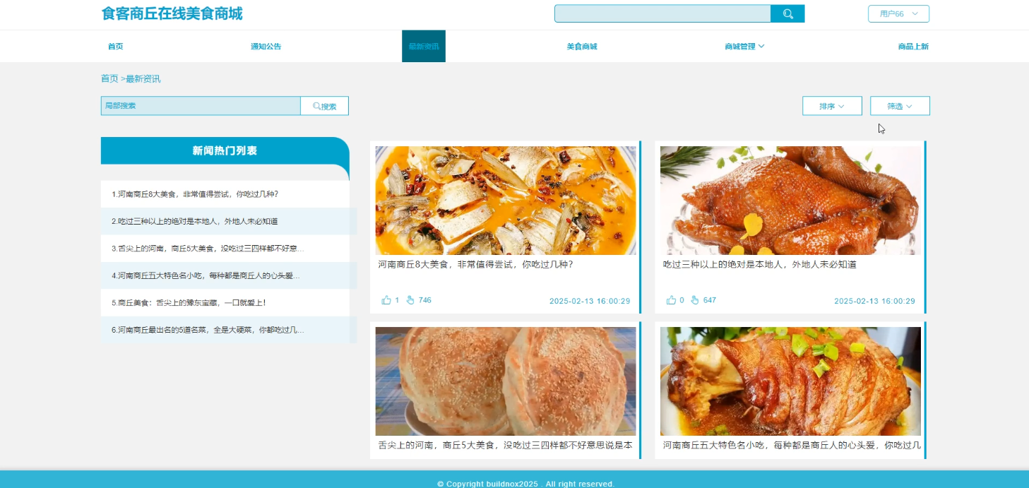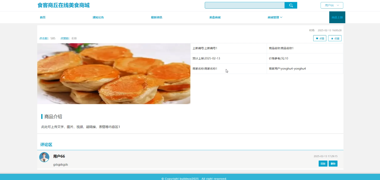 用户在商品上新页面浏览新上架的美食,点击“点赞”“收藏”或“评论”按钮对美食进行互动操作,系统实时更新点赞、收藏和评论数量。商品上新界面如图5-3所示。