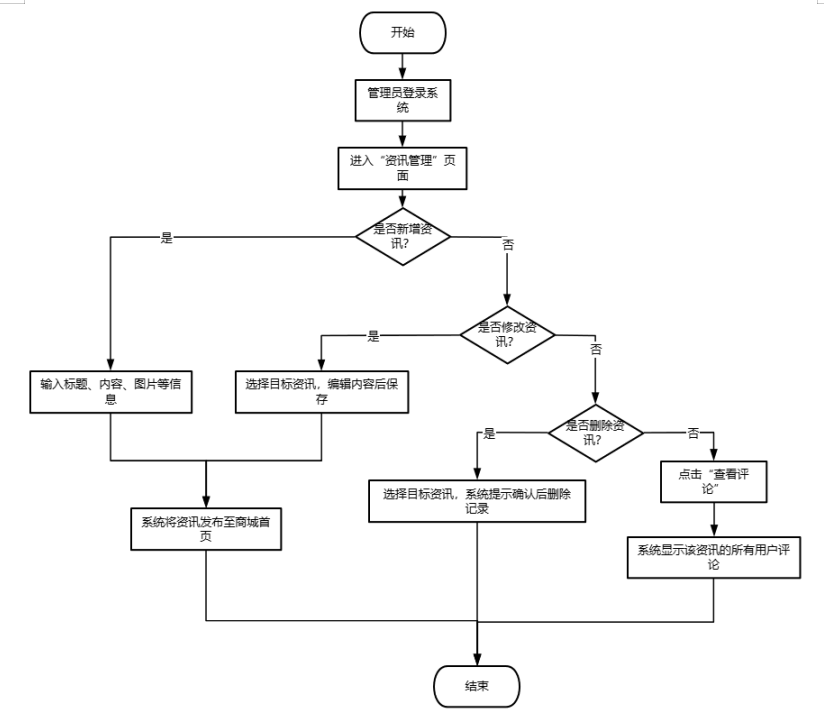 管理员登录系统,进入“资讯管理”页面。点击“新增资讯”,输入标题、内容、图片等信息,系统将资讯发布至商城首页;点击“修改资讯”,选择目标资讯,编辑内容后保存,系统更新资讯信息;点击“删除资讯”,选择目标资讯,系统提示确认后删除记录;点击“查看评论”,系统显示该资讯的所有用户评论,管理员可据此优化内容或处理不当言论。如图3-7所示。