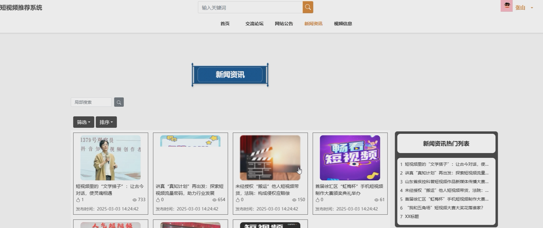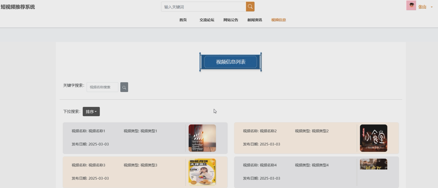 This paper designs and implements a short video recommendation system based on collaborative filtering, developed using the Django framework. The system is divided into two main parts: the administrator end and the registered user end. The administrator side includes functional modules such as video type management, video information management, rating information management, system management, website announcement management, resource management, communication management, and permission management, aiming to achieve efficient management and maintenance of platform content. The registered user end provides functional modules such as homepage, communication forum, website announcement, news and information, video information, personal account, and personal center to help users efficiently browse, rate, and manage their personal content.