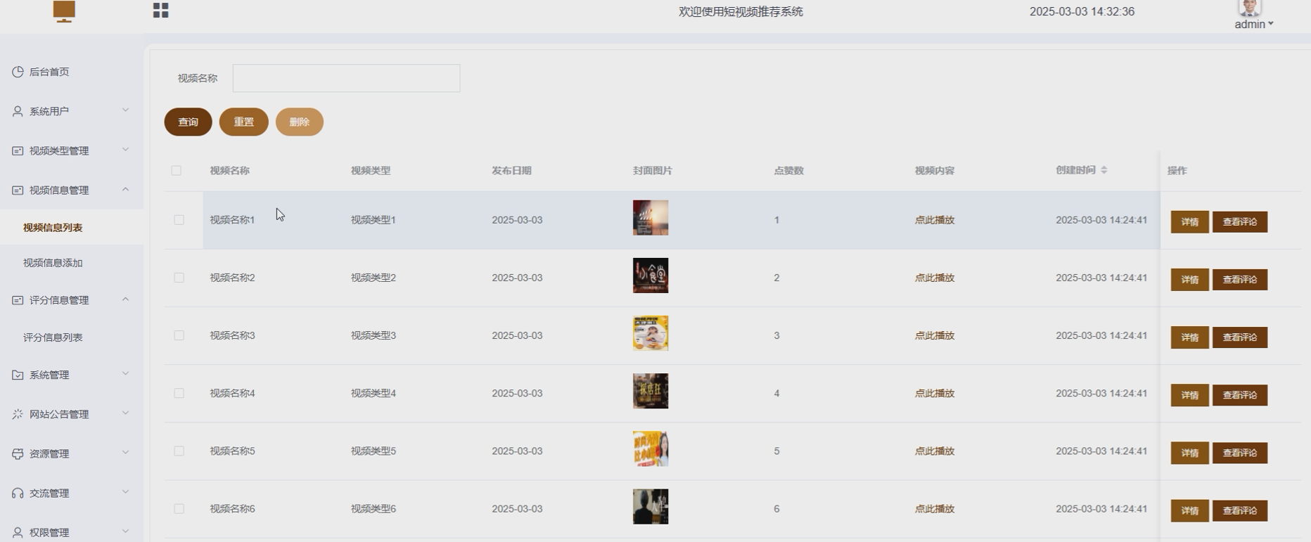 本短视频推荐系统在设计上注重用户体验,界面简洁、操作直观,能够满足不同用户的使用需求。管理员可以轻松管理视频内容、用户信息、评论和举报等,同时对平台的运营情况进行实时监控。注册用户则能够通过简单的操作流程,快速浏览视频内容,并根据自己的兴趣获取个性化的推荐。通过合理的权限管理和信息展示方式,系统的操作流程清晰易懂,无需用户具备过多的专业背景即可高效使用。此外,系统的架构具备较高的可扩展性和灵活性。未来可以根据用户反馈和需求不断优化推荐策略、调整功能模块,进一步提升用户的操作体验。平台还能够根据不同的视频类型和用户行为,动态调整推荐内容,确保系统始终为用户提供相关性强且符合兴趣的视频内容,提升用户粘性和平台活跃度。