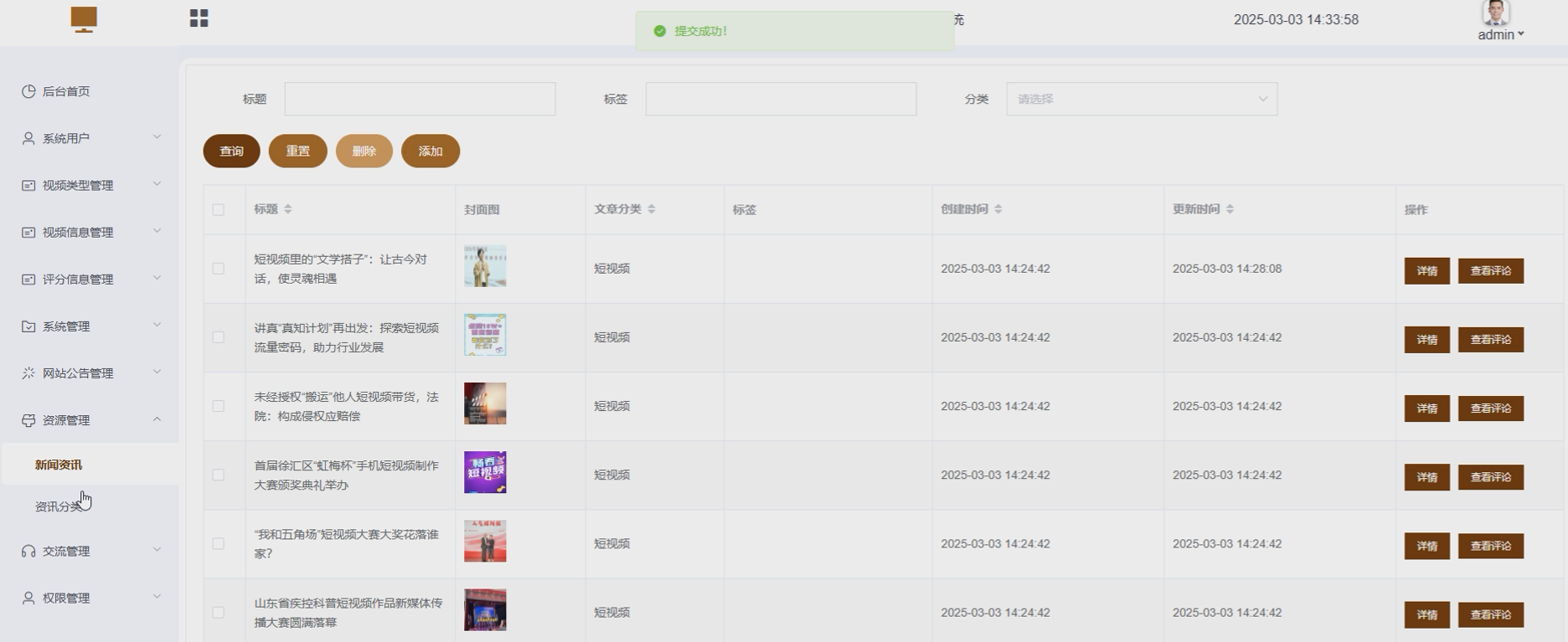 (4)视频信息管理:对平台视频的上传、审核、修改和删除等操作进行管理,保证平台视频内容的质量与合法性。