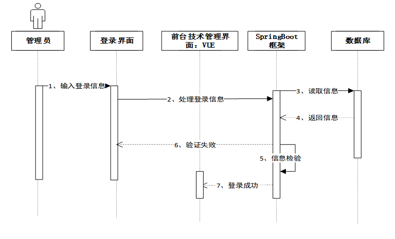 管理员输入登录信息后,登录界面将信息传递至前台管理界面,随后通过SpringBoot框架读取数据库中的用户信息并返回。系统验证信息,若验证成功则登录成功,若验证失败则返回错误提示。登录时序图如图4-4所示。