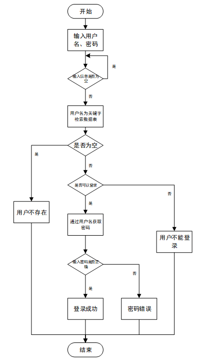 用户输入用户名和密码后,系统先检查输入是否为空,再验证用户名是否存在,若存在则通过用户名获取密码并校验。若密码正确则登录成功,否则提示密码错误。若用户名不存在或无法登录,提示用户操作无效。如图3-4所示。