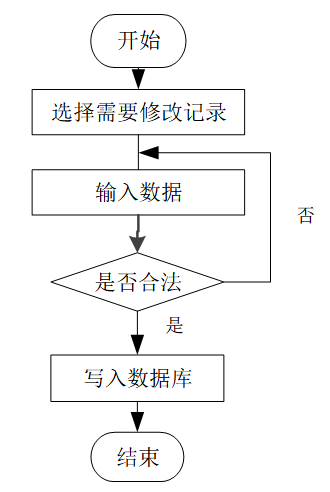 用户首先选择需要修改的记录,输入修改后的数据,系统判断输入数据是否合法。若数据不合法,提示重新输入;若数据合法,则将修改后的数据写入数据库,完成操作后流程结束。修改信息流程图如图3-7所示。